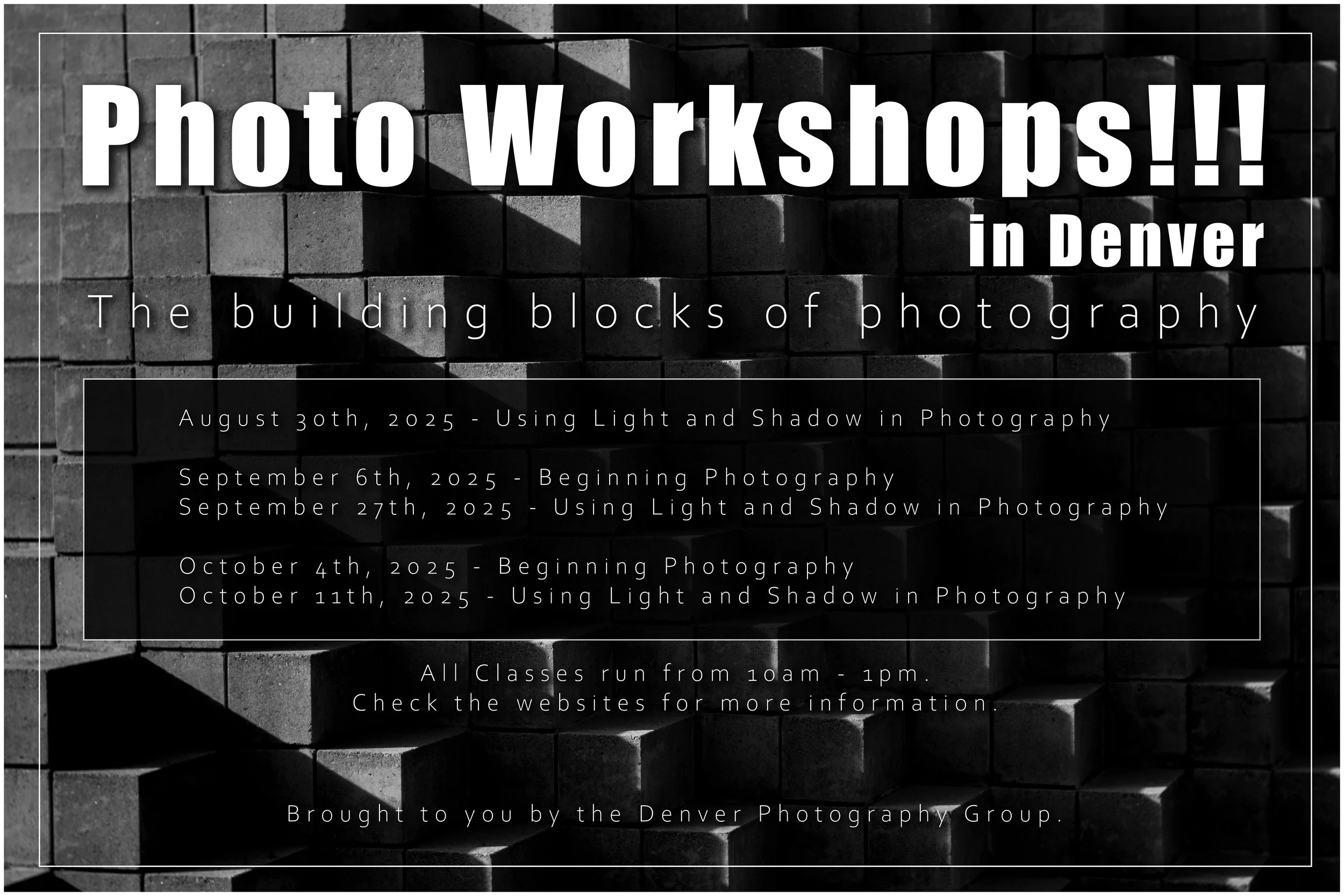 I’ve teamed up with the Denver Photography Group and have will be starting a number of workshops coming up the end of August through the middle of October. Three different themes making up the building blocks of photography : Beginning Photography, Using Light and Shadow in Photography and Understanding Metering.